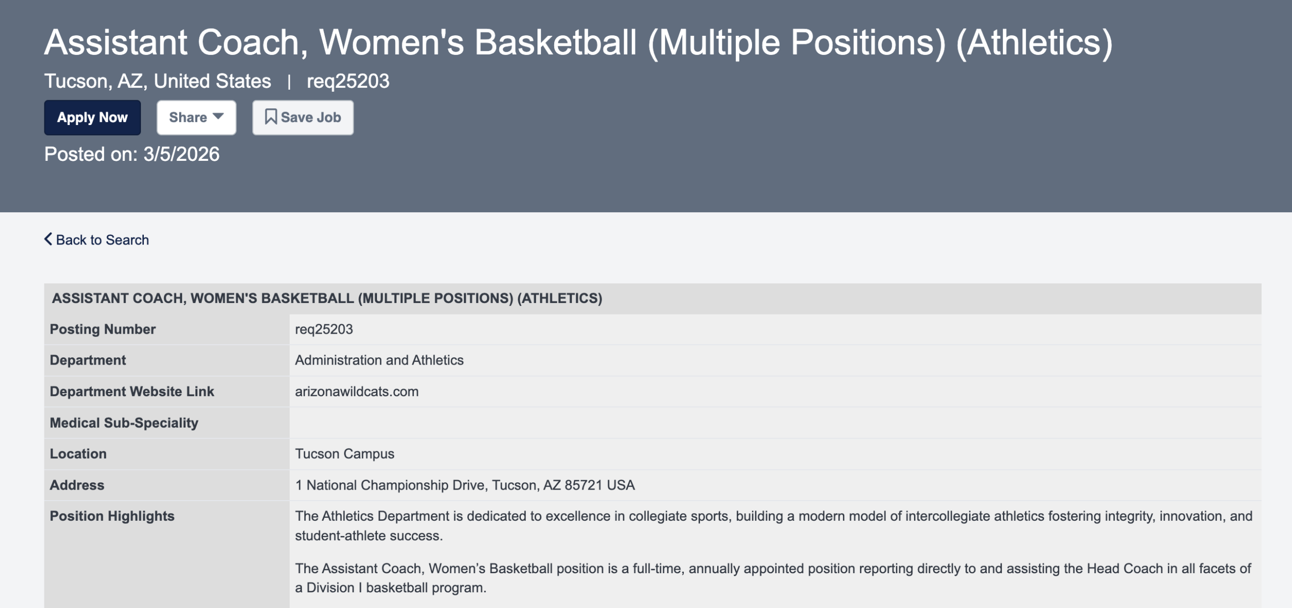 While Marciniak is the first public announcement, Burke will be on the hunt for more than just one open position on the staff heading into the 2026-27 season. On Thursday, March 5, three assistant coach positions were posted on UA Talent, the University of Arizona’s job portal. Despite the three open positions, a spokesperson from the university tells us its is unclear whether Burke will replace Marciniak with another general manager, hire an additional assistant coach, or redesign the roles on the staff.